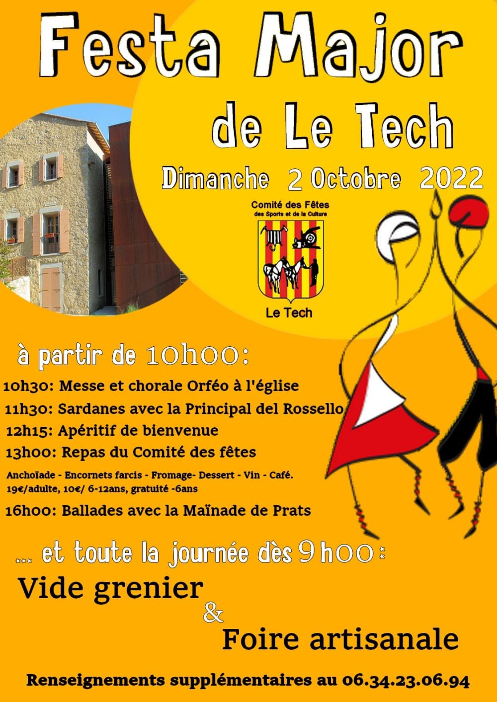 - 13h00 : Repas du comité des fêtes (Anchoïade, encornets farcis, fromage, dessert, vin, café. (19€ /adulte, 10€ / 6-12ans, Gratuit / – 6ans)